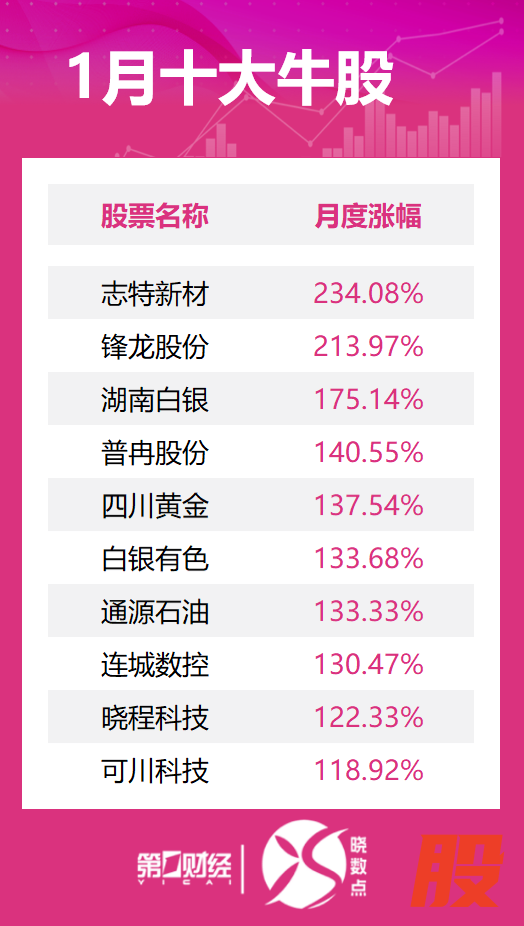 在剔除最近半年上市的新股后,截至1月30日收盘,1月十大牛股中涨幅最大的为志特新材,累计涨幅234.08%;其次为锋龙股份,累计涨幅213.97%。这10股中有2股涨幅超过200%,这10股涨幅均超110%。